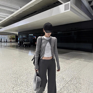 5werkwen针织开衫女灰色短款圆领外搭韩系春夏外套百搭长袖上衣潮