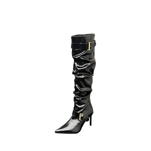辣妹风欧美尖头白色堆堆靴高跟长筒靴女2025秋季皮带扣高跟长靴