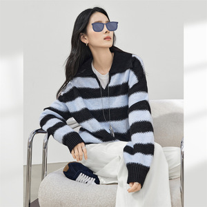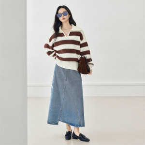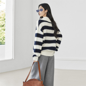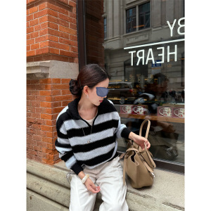 对白慵懒风宽松翻领条纹毛衣女2025秋季新款绵羊毛软糯休闲针织衫
