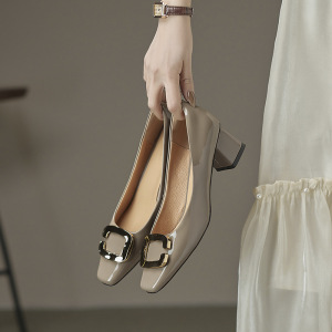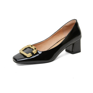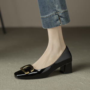 方头方扣粗跟里外全皮时尚高跟鞋女漆皮单鞋金属方扣浅口通勤女鞋