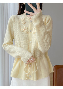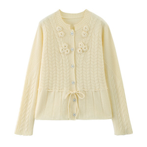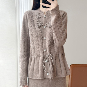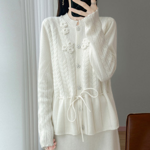 25秋季新款圆领钩花100%羊毛开衫女宽松气质麻花腰绳羊绒针织毛衣