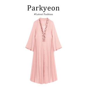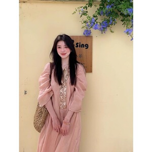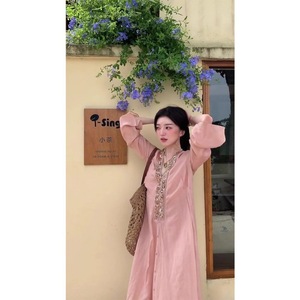 波西米亚度假风V领亮片衬衫连衣裙女秋季绝美飘逸长裙