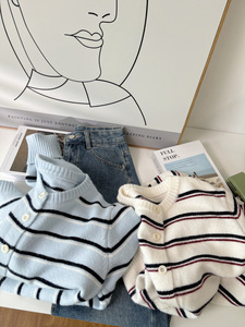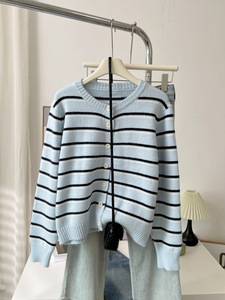 抖音爆款超软糯弹性圆领上衣 撞色条纹单排扣~针织开衫百搭款6143
