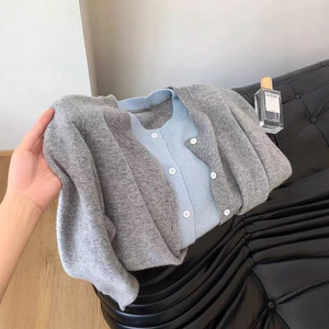 韩系假两件灰色针织开衫毛衣外套女气质设计感慵懒风早秋chic上衣