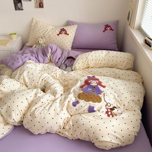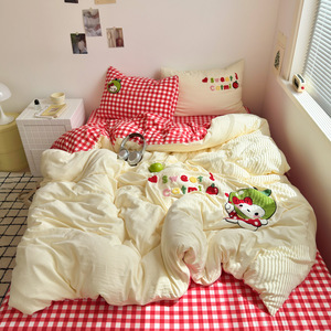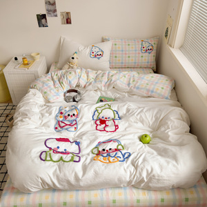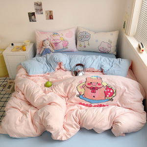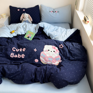 ins蛋糕猫毛巾绣纯水洗棉床上四件套被套卡通风学生宿舍款三件套