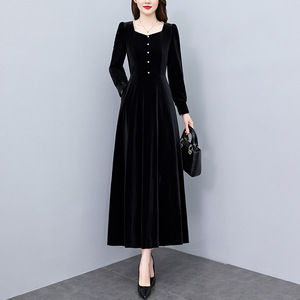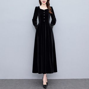 大码女装法式赫本风黑色金丝绒连衣裙春秋冬季新款高级感方领长裙