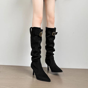 2025年秋冬韩版新款尖头不过膝靴细跟高跟长靴皮带扣绒面高筒靴女