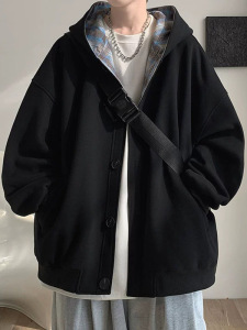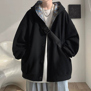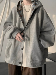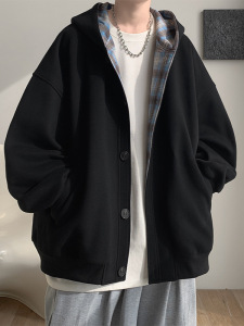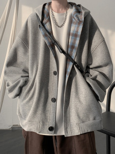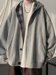 拼接格子连帽卫衣男春秋新款潮流高级感开衫外套宽松休闲百搭夹克