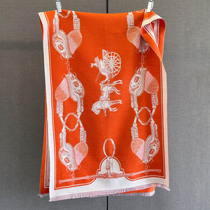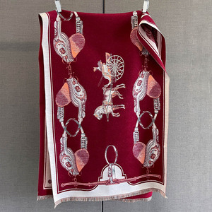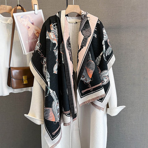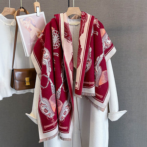 秋季时尚保暖仿羊绒围巾女百搭两用加厚围脖锁链马车提花图案披肩
