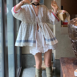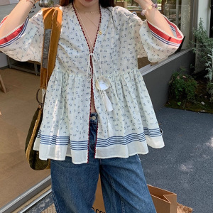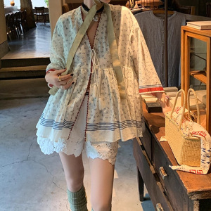 自然原野小碎花量感下摆七分袖绑带袍式上衣宽松复古2025秋季