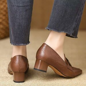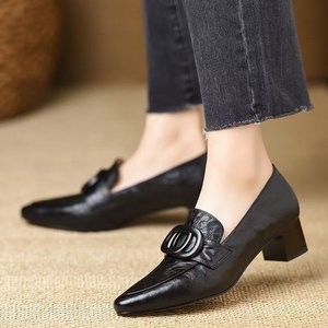 粗跟尖头深口单鞋女2025秋季新款舒适软皮中跟小皮鞋时尚百搭女鞋