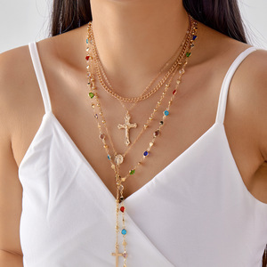 欧美跨境复古轻奢高级感镶钻十字架项链女个性叠戴长链条流苏颈链