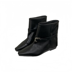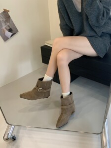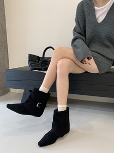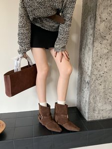 2025夏季新款尖头粗跟中跟短筒褶皱堆堆靴女外穿皮带扣低跟鞋短靴