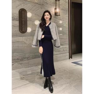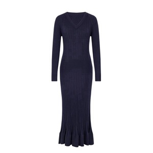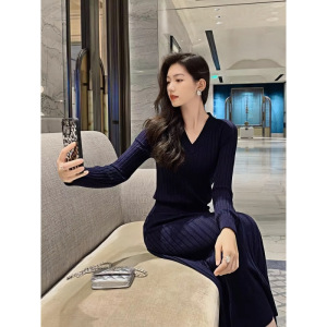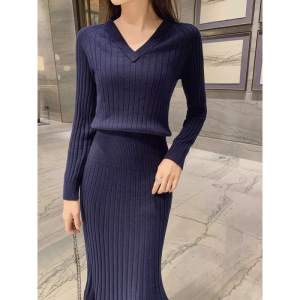 7628 聚光灯针织连衣裙 红毯女神!坑条肌理V领收腰鱼尾裙