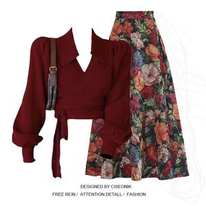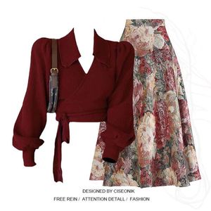 高级感2025年新款翻领酒红色上衣女搭配复古半身裙胖mm显瘦两件套