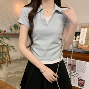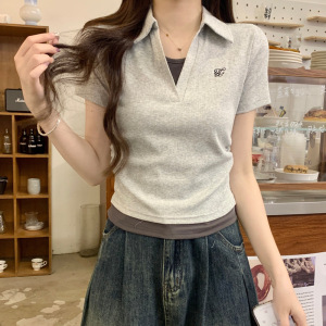 蓝色polo领长袖打底T恤女2025秋可盐可甜假两件刺绣褶皱显白上衣