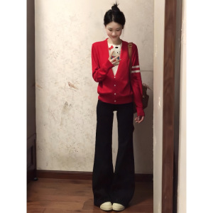 超火ootd穿搭一整套秋季慵懒风假两件针织开衫微喇牛仔裤两件套潮