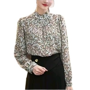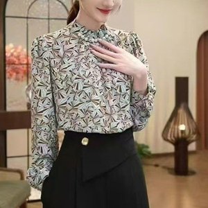 一件代发2025秋季新款时尚半高领长袖复古印花百搭气质女装衬衫