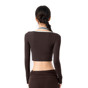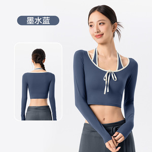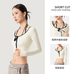 撞色挂脖假两件瑜伽服长袖女带胸垫抗起球训练普拉提运动健身上衣