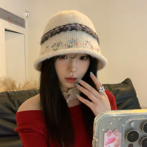 秋冬季彩色糖豆卷边针织盆帽女保暖护耳毛线帽子民族风提花渔夫帽