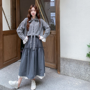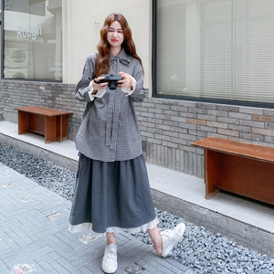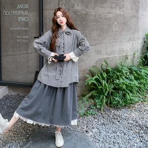 实拍灰色洋气时尚松弛感格子衬衫套装裙2025秋新款蕾丝半裙两件套