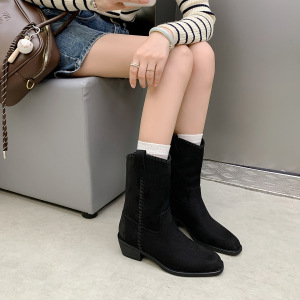 真皮西部牛仔靴子骑士靴女美拉德显瘦粗跟尖头短靴复古中筒马丁靴