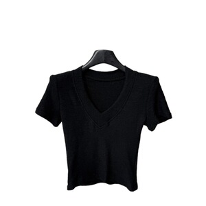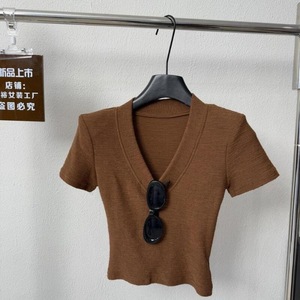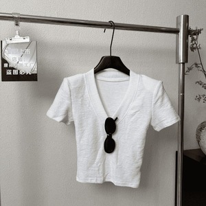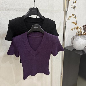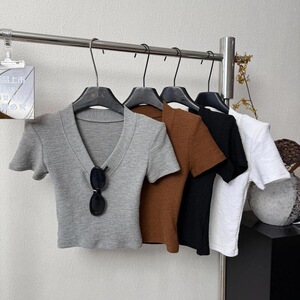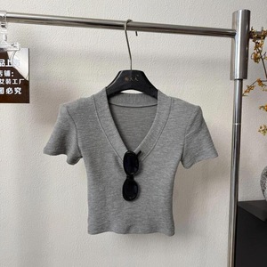 厚包边2025大V领辣妹中高腰修身女上显瘦纯色短袖时尚垫肩气质款