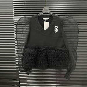2025年早秋新款小众网纱泡泡袖拼接假两件女韩系时尚V领针织上衣