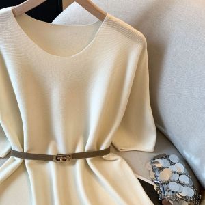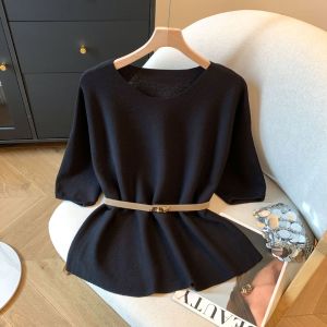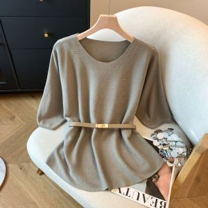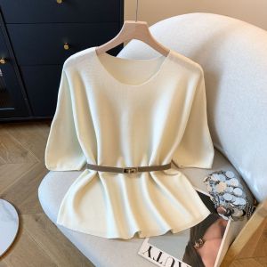广州十三行高货爆款~慵懒风薄款圆领宽松短袖针织衫配皮带上衣夏