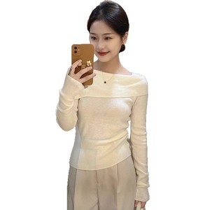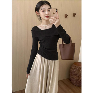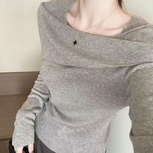 春秋薄款一字肩长袖打底针织衫上衣春秋设计感小众斜肩毛衣女内搭