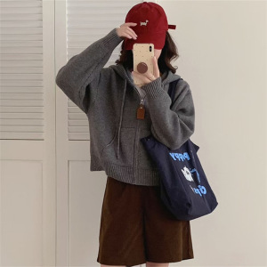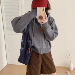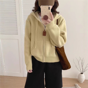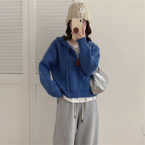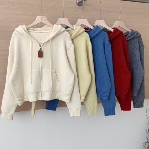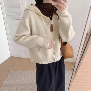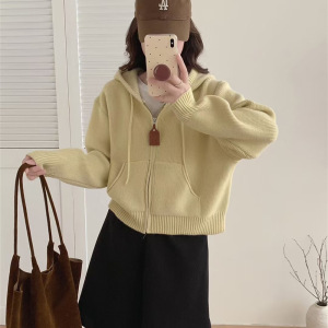 韩系休闲连帽毛衣外套女秋冬新款时尚宽松慵懒风短款针织开衫上衣