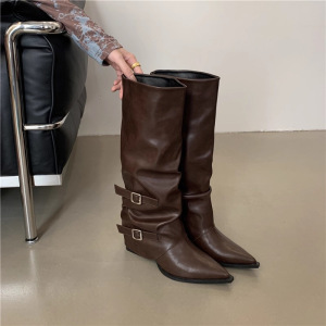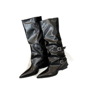 尖头搭扣褶皱堆堆靴2025春秋朋克风骑士靴中跟炸街辣妹高筒裤筒靴