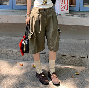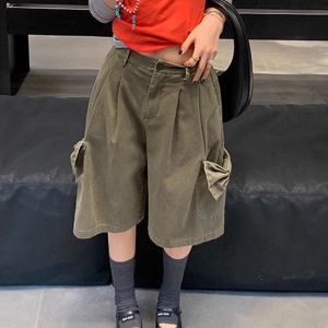 天生博主做旧水洗军绿色蝴蝶结口袋阔腿中裤休闲五分裤子