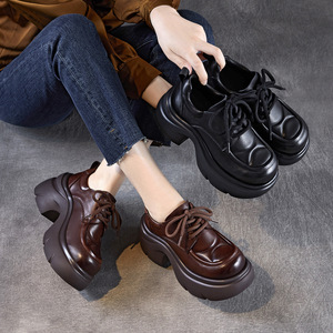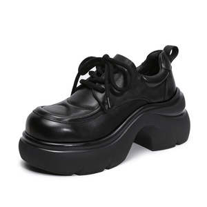 圆头系带小个子厚底增高乐福鞋女2025秋新真皮时尚小皮鞋深口单鞋
