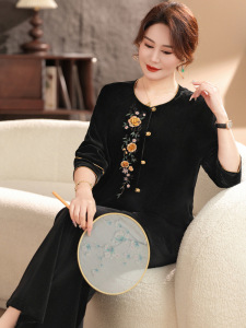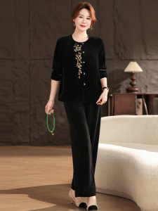 中老年大码女装女士休闲两件套春季新款金丝绒妈妈套装女时尚休闲