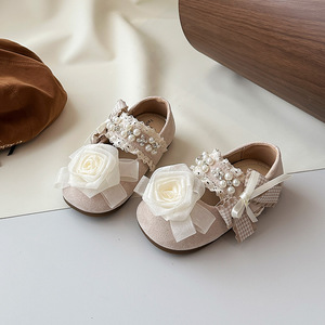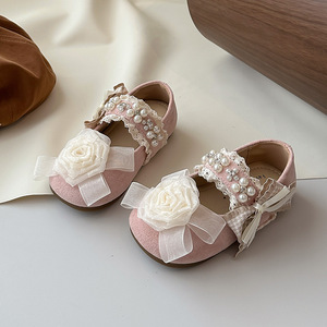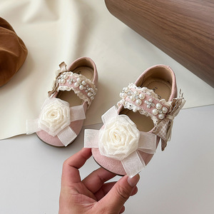 女童小皮鞋2025秋上新网纱玫瑰花朵单鞋女孩水钻珍珠蝴蝶结公主鞋