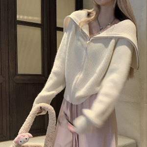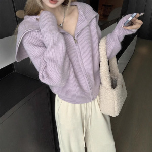 韩系大翻领毛衣外套女2025新款双拉链纯色简约宽松慵懒风针织开衫
