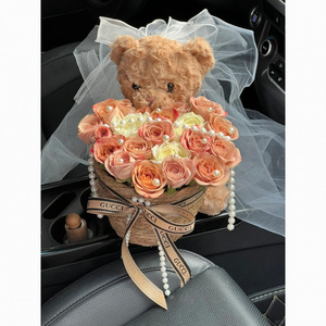 永生花小熊抱抱桶头纱花束仿真玫瑰皂花送女朋友送闺蜜生日礼物花