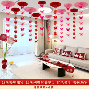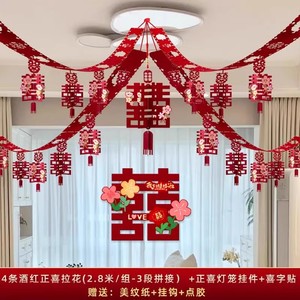 结婚女方出嫁闺房卧室吊顶喜字拉花装饰男方新婚房间主卧顶部布置