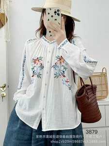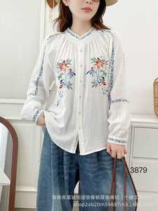 3879文艺复古棉刺绣衬衫女秋季新款宽松圆领灯笼袖上衣