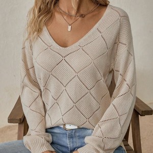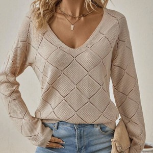 跨境欧美春夏亚马逊V领毛衣 纯色休闲百搭套头长袖女装针织衫