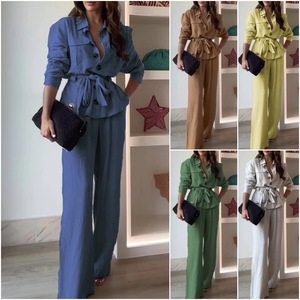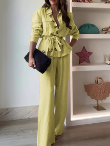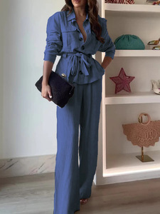 欧美跨境女装两件套女2025翻领长袖衬衫纽扣休闲纯色裤阔腿套装