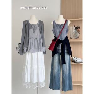 秋季2025新款 韩系百搭温柔针织开衫+格纹叠穿背心上衣女两件套