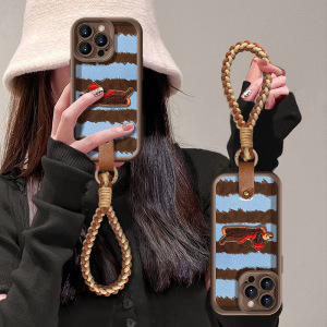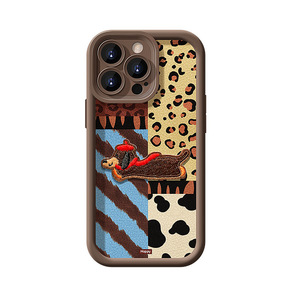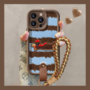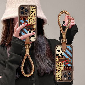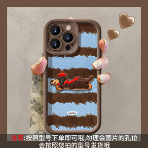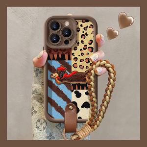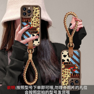 拼接豹纹小狗挂绳适用苹果16小羊皮手机壳13promax秋冬15美拉德11