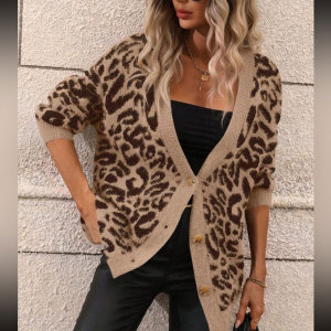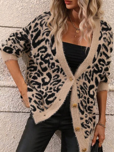 欧美秋冬新款毛衣女装 亚马逊大码宽松针织v领豹纹长袖开衫外套女