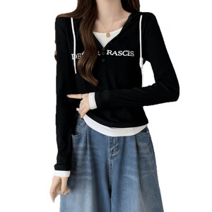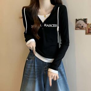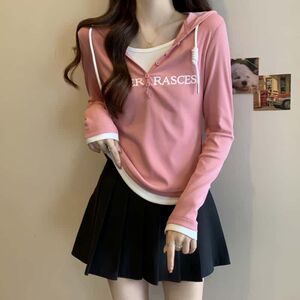大码女装正肩设计感假两件长袖T恤打底衫胖MM收腰内搭连帽上衣女