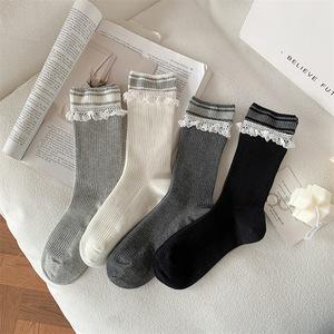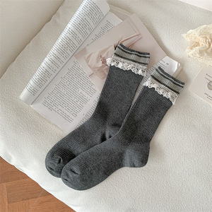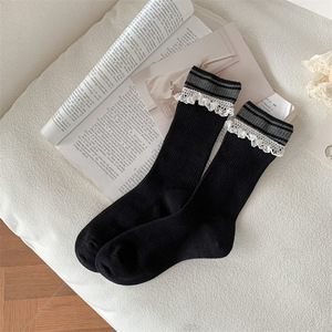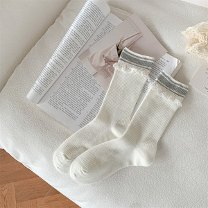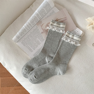 美式miu风蕾丝条纹运动花边休闲百搭学院风中筒袜纯色堆堆袜子女