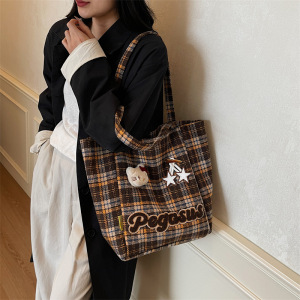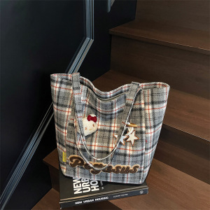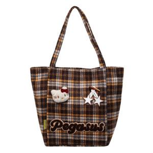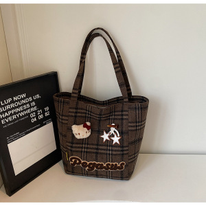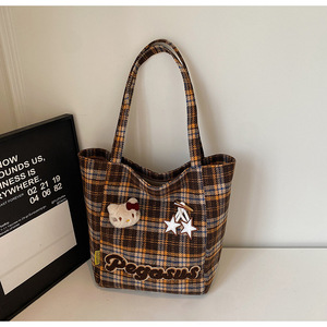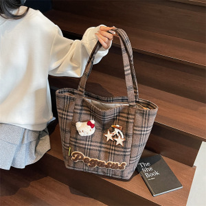 韩版可爱kt刺绣格子托特包包女学生上课大容量带拉链通勤单肩包包