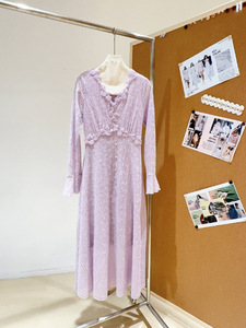南油2025原创新款设计女装长袖V领蕾丝花边长裙法式风收腰连衣裙