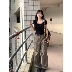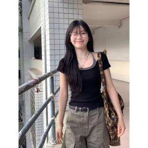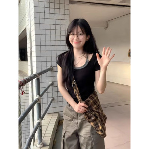 美式复古黑色假两件正肩短袖T恤女夏季辣妹拼接短款上衣女批发